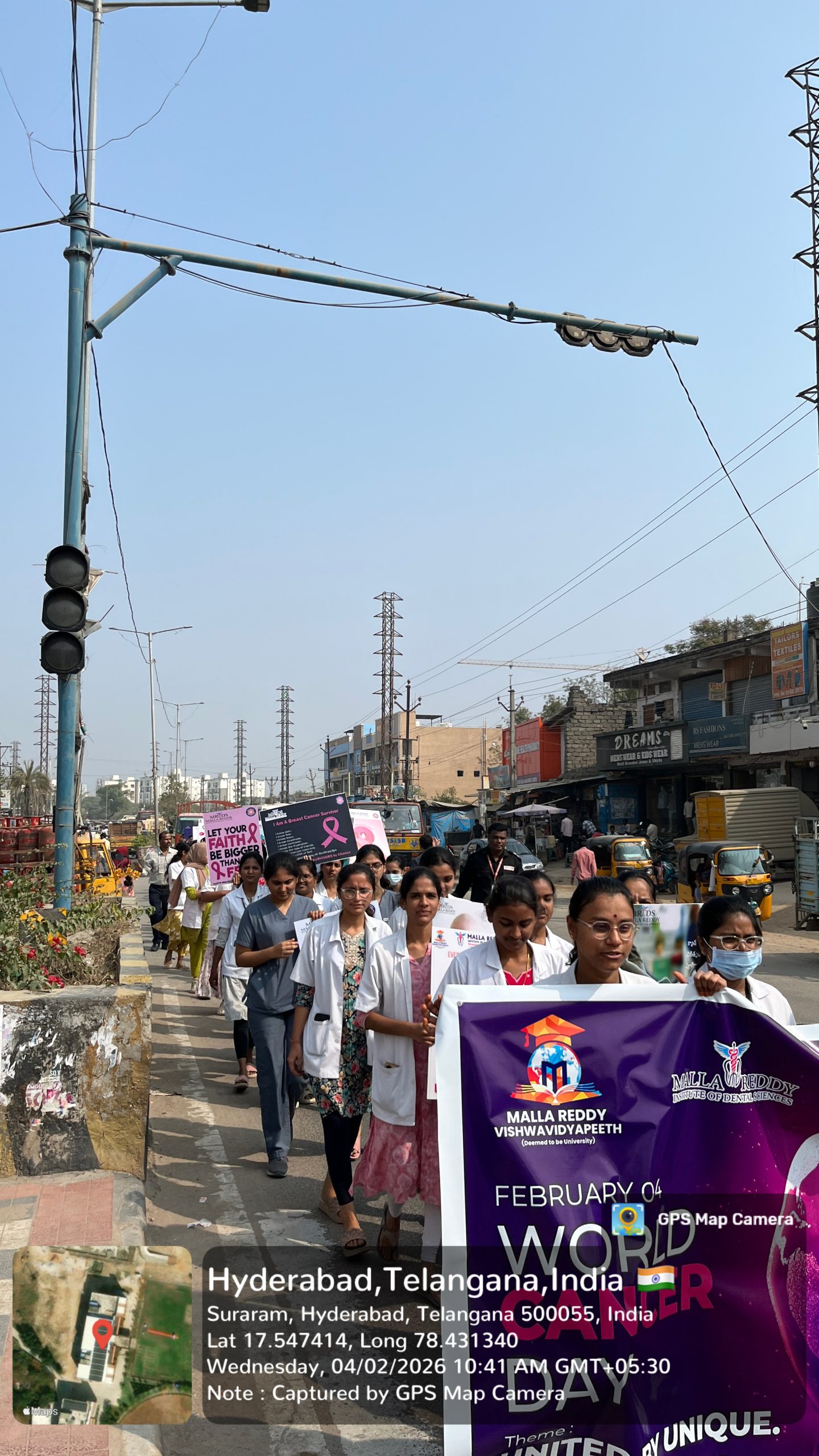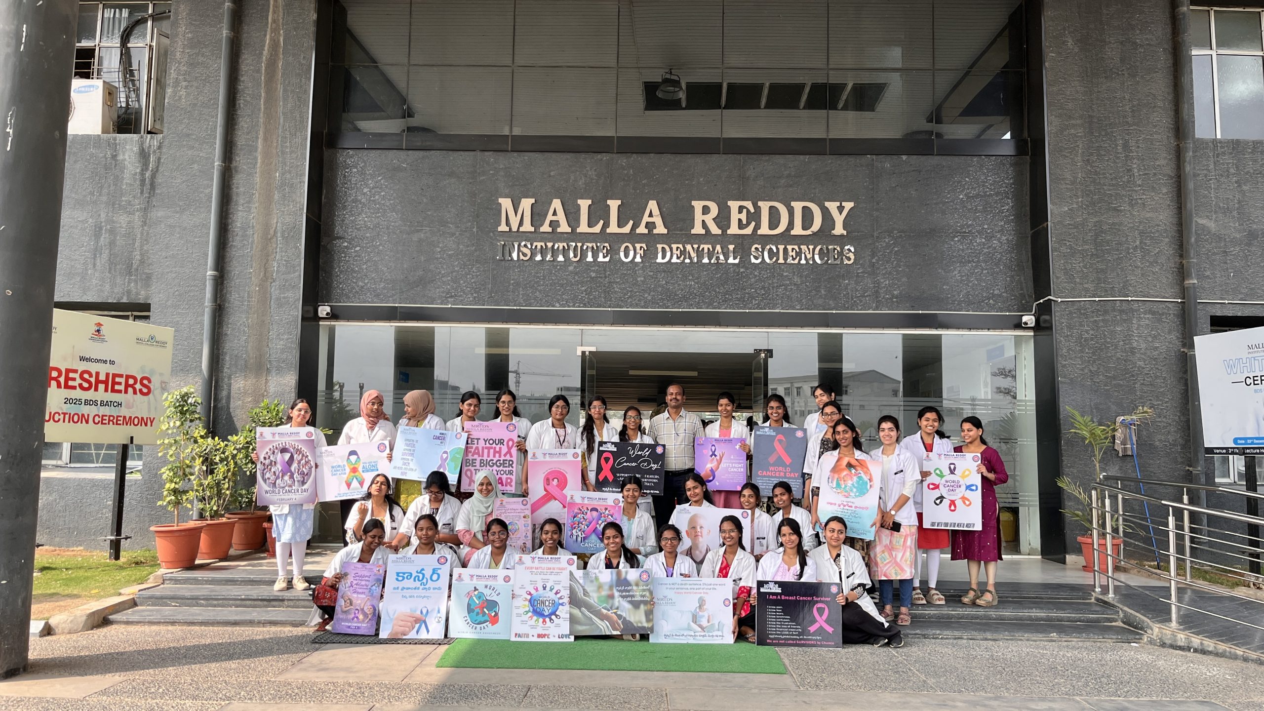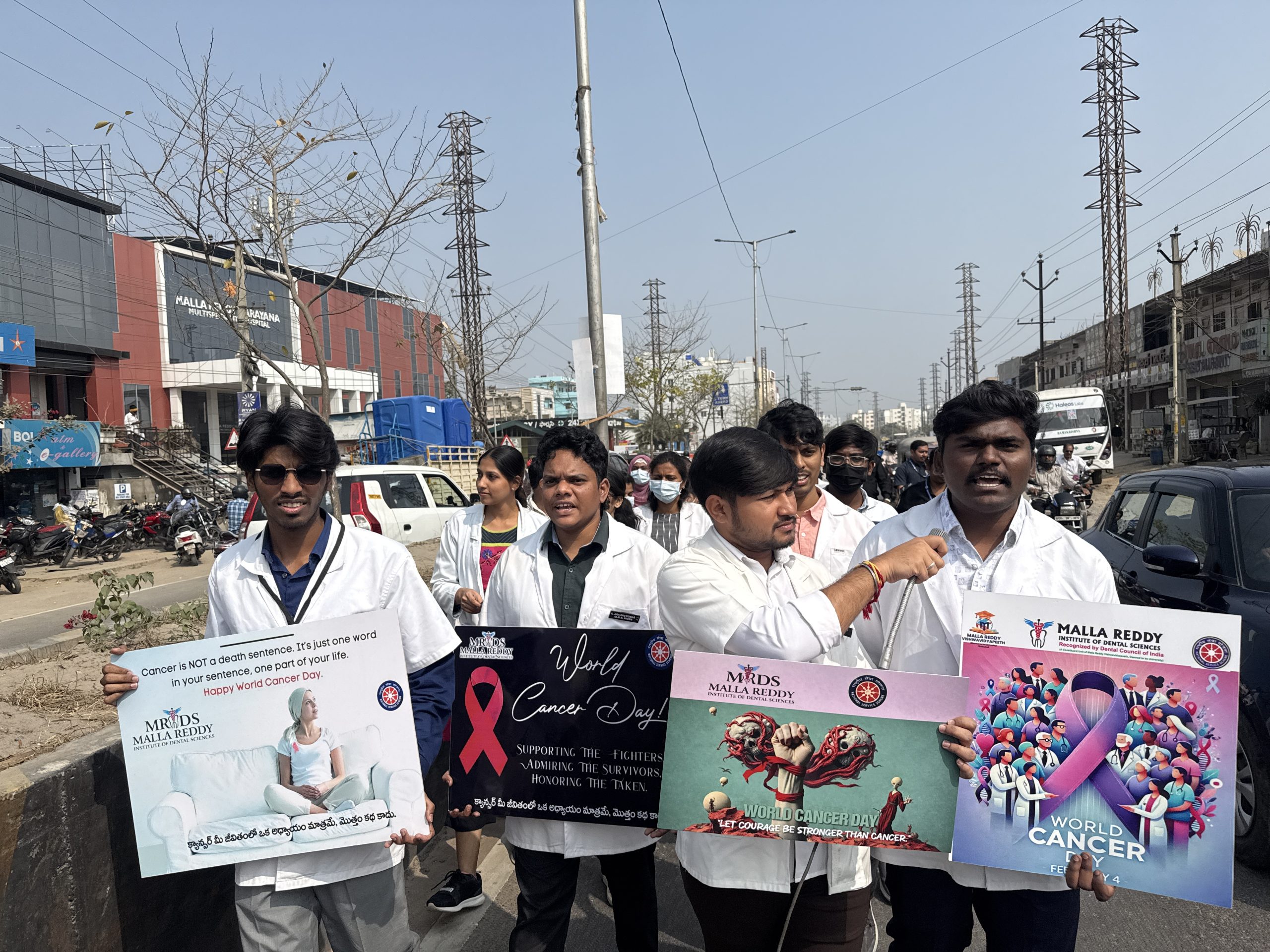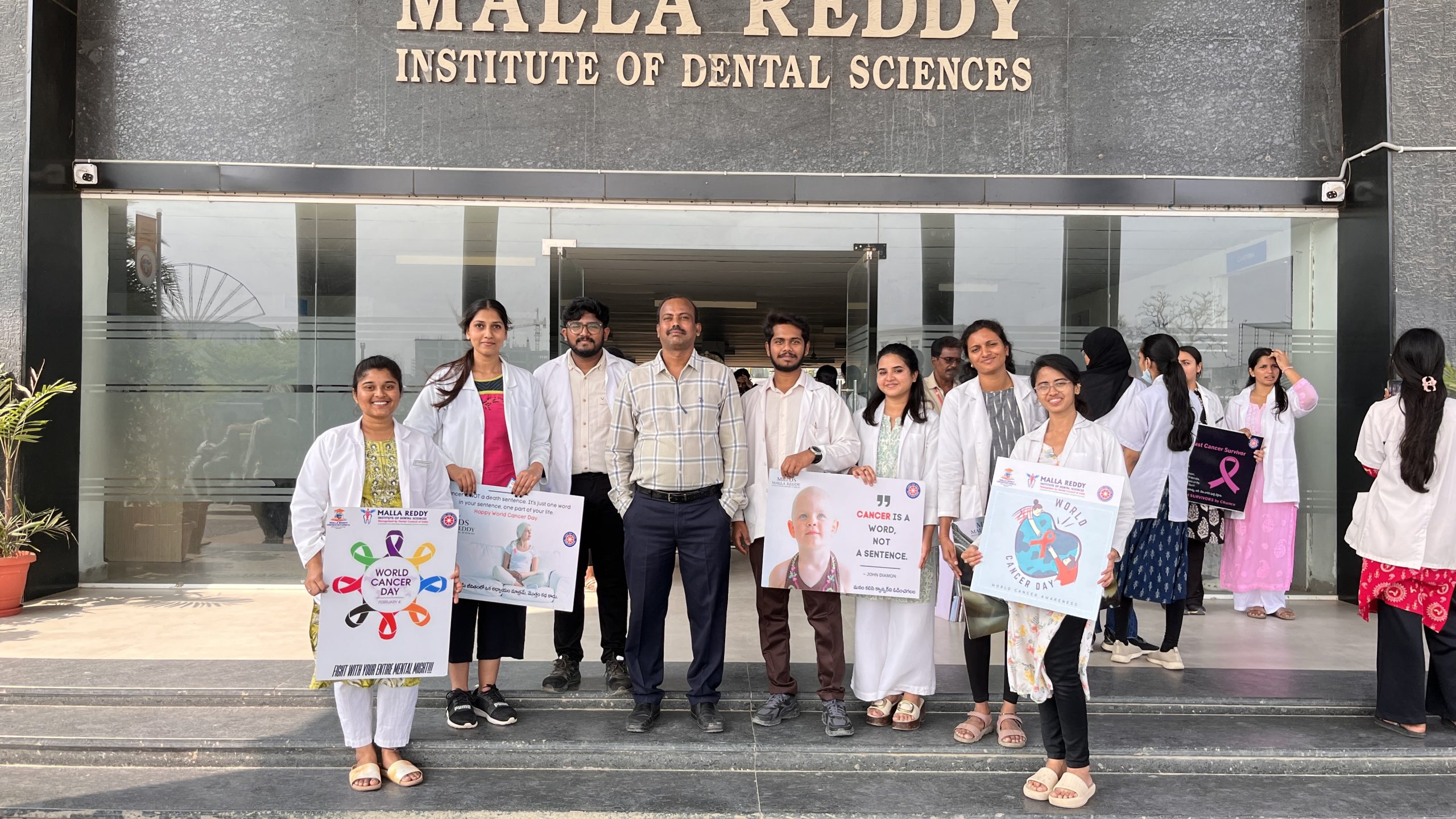 Malla Reddy Institute of Dental Sciences, in association with Malla Reddy Cancer Hospital and Research Institute, organized an Awareness Walk on the occasion of World Cancer Day. The event aimed to promote cancer prevention, early detection, and community awareness. Students actively participated in the walk, spreading key messages on cancer prevention, healthy lifestyle practices, and the importance of regular screenings. The participants also expressed solidarity and extended moral support to cancer survivors, reinforcing the message of hope, resilience, and collective responsibility in the fight against cancer.