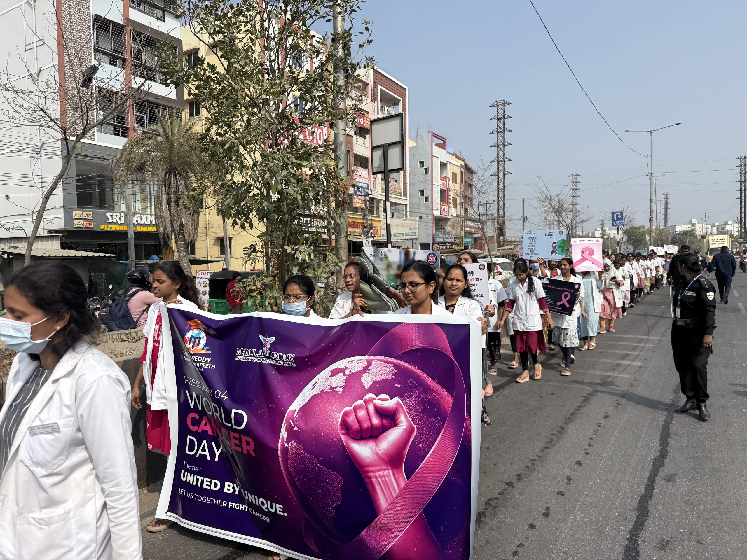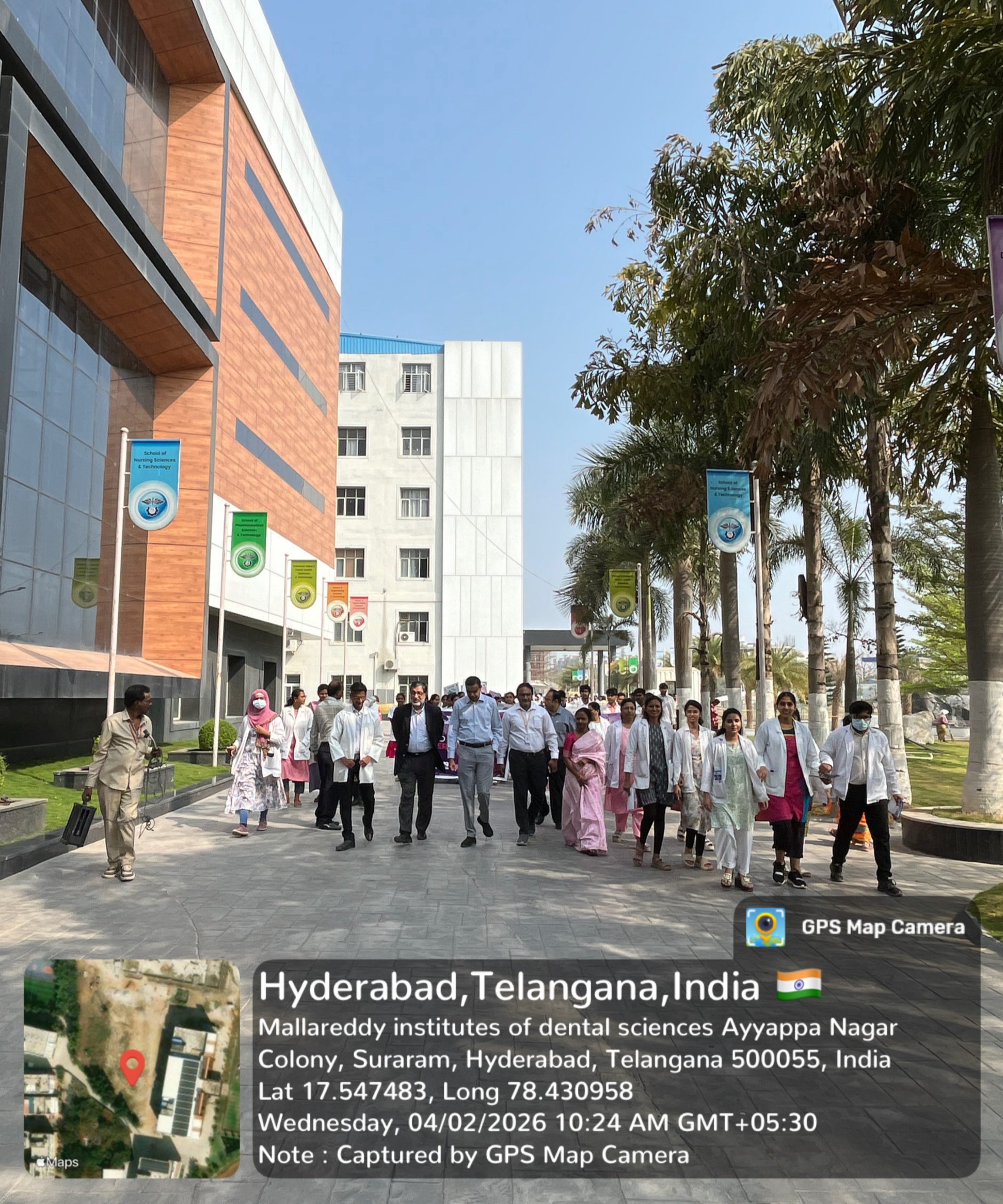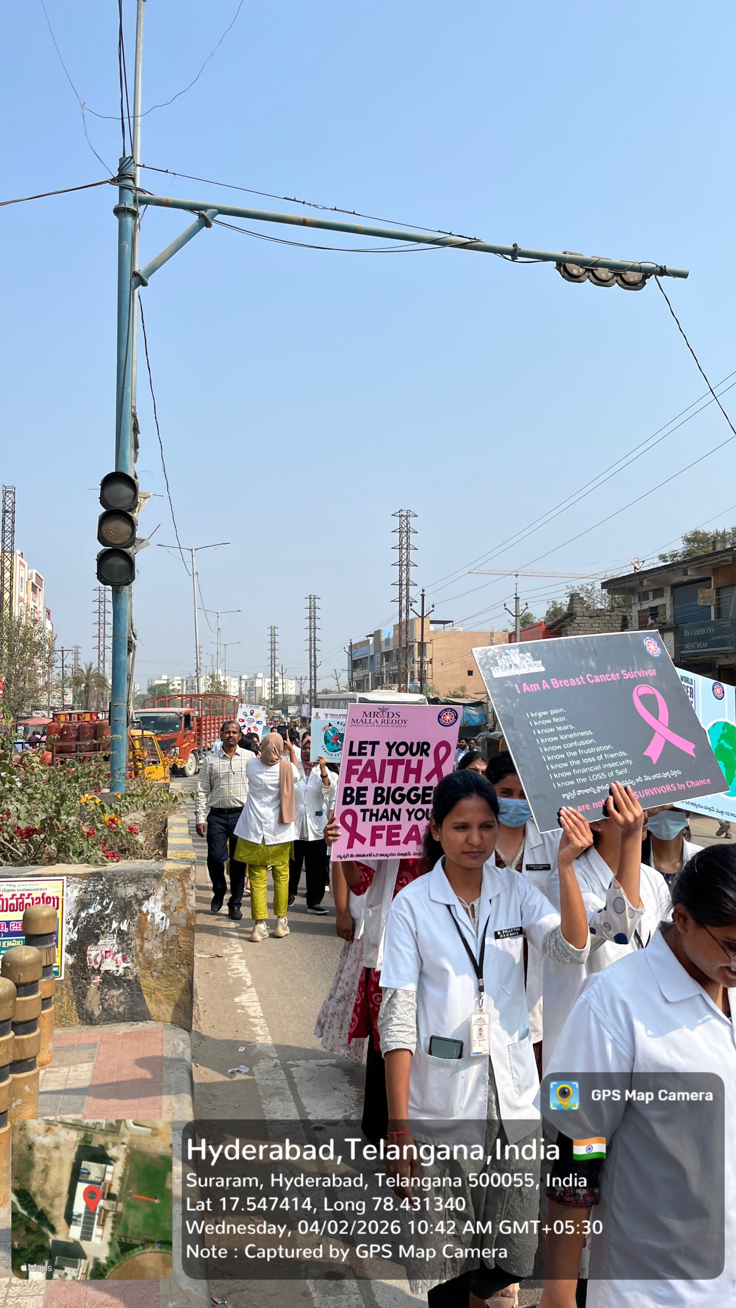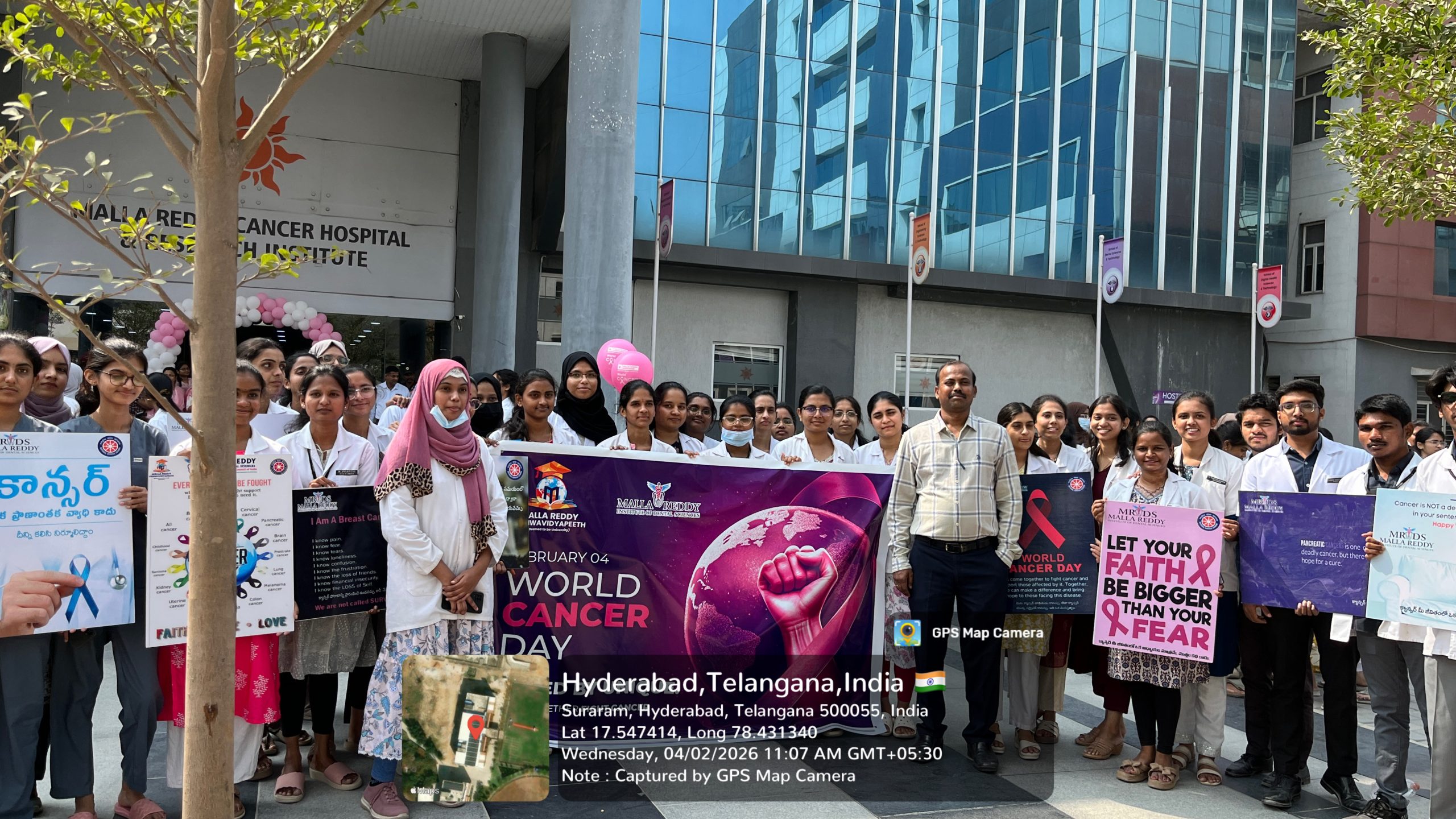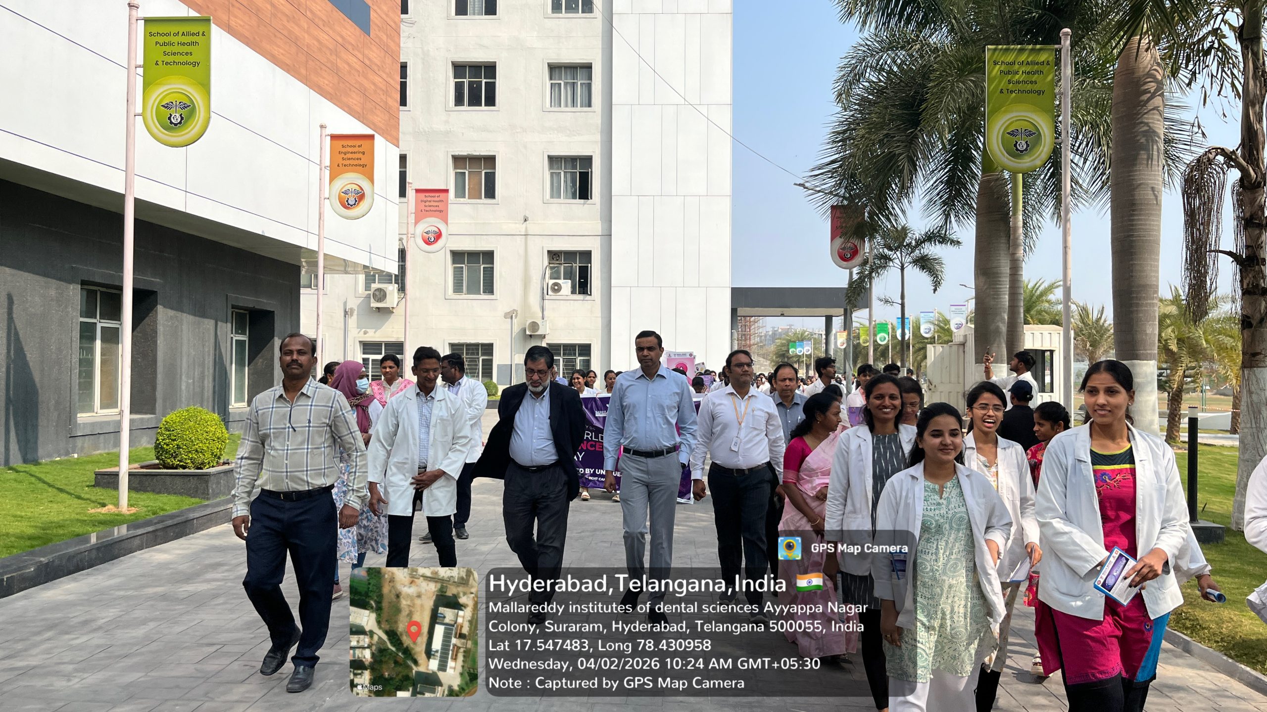 Malla Reddy Institute of Dental Sciences, in association with Malla Reddy Cancer Hospital and Research Institute, organized an Awareness Walk on the occasion of World Cancer Day. The event aimed to promote cancer prevention, early detection, and community awareness. Students actively participated in the walk, spreading key messages on cancer prevention, healthy lifestyle practices, and the importance of regular screenings. The participants also expressed solidarity and extended moral support to cancer survivors, reinforcing the message of hope, resilience, and collective responsibility in the fight against cancer.